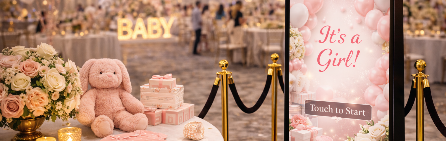 Whether your baby shower is hosted at a private home, banquet hall, restaurant, or event venue, our elegant full-length mirror booth enhances the atmosphere with modern entertainment and professional presentation.